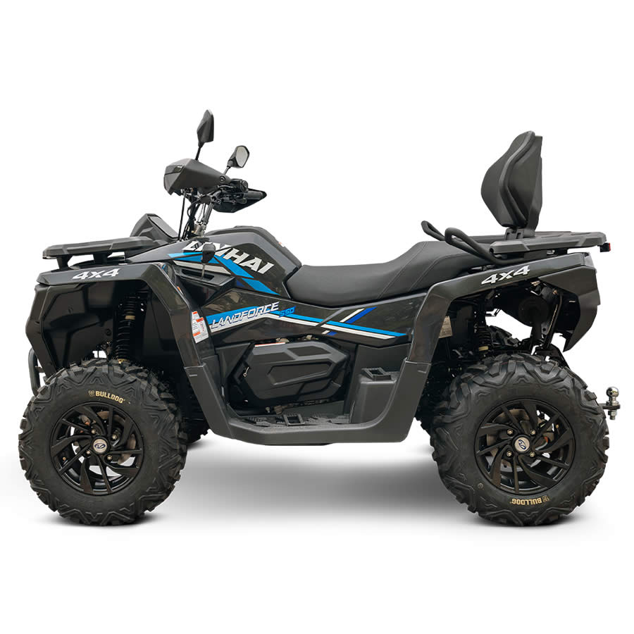 LINHAI Landforce 550L oferuje wyjątkowo bogate wyposażenie, w którym nie brakuje atrakcyjnych 12-calowych felg aluminiowych z markowymi oponami Bulldog 25″, elektrycznej wyciągarki o udźwigu 3000 funtów, homologowanego haka holowniczego, kolorowego 7-calowego wyświetlacza TFT lub elektrycznego wspomagania kierownicy EPS. Wszystko, co chcesz zabrać ze sobą, zmieści się do pojemnych bagażników z materiałów kompozytowych i praktycznych schowków. Wyposażenie obejmuje również ochraniacze dłoni, gniazdo 12 V, port USB oraz wygodne podwyższone siedzenie pasażera.