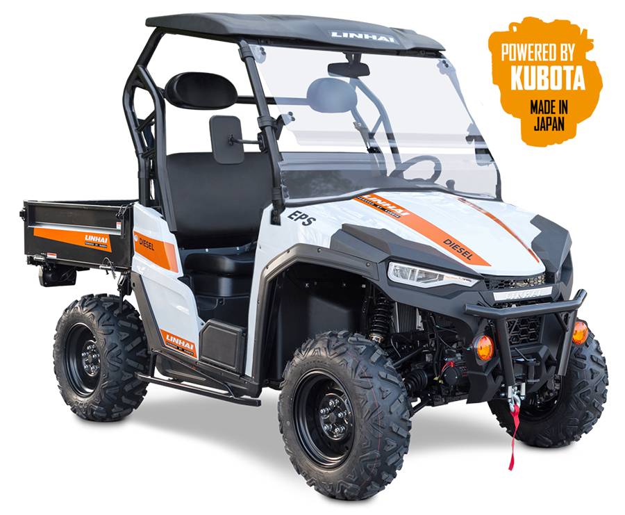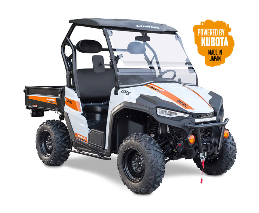 Niezawodny Linhai UTV1100 Kubota Diesel przekonuje również swoim bogatym wyposażeniem w podstawowej cenie. Standardowe wyposażenie obejmuje elektryczne wspomaganie kierownicy EPS, bardzo mocną wciągarkę o sile uciągu 4500 lbs, składane ochrony stóp, przedni zderzak, stalowe ramy ochronne, 14-calowe koła z sześcio-warstwowymi oponami, dach z tworzywa sztucznego odpornego na promieniowanie UV, klatkę ochronną z certyfikatem ROPS, kulę haka holowniczego, siedzenia z pasami bezpieczeństwa dla zwiększenia bezpieczeństwa załogi, schowek w desce rozdzielczej, podwójne reflektory projektorowe, światła do jazdy dziennej LED, akustyczną sygnalizację cofania.