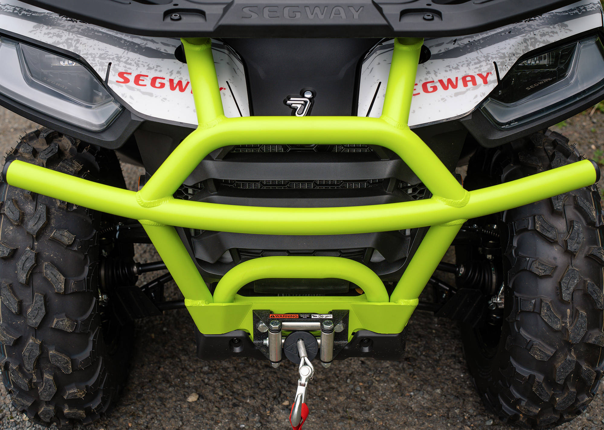 Solidny aluminiowy przedni zderzak do quada SEGWAY AT5, wykonany z utwardzanego aluminium klasy 6060-T5. Zderzak ma zielone wykończenie i można go łatwo zamontować.
