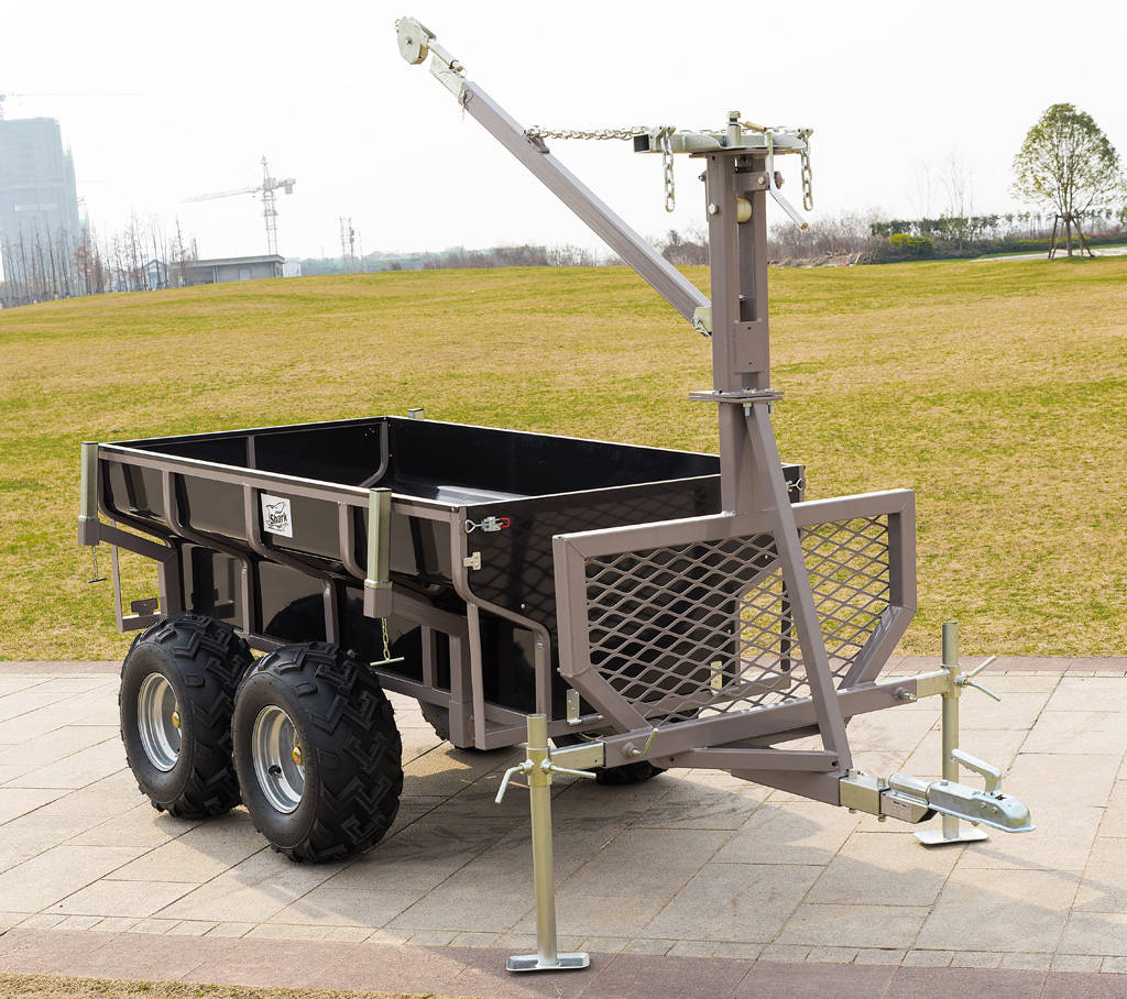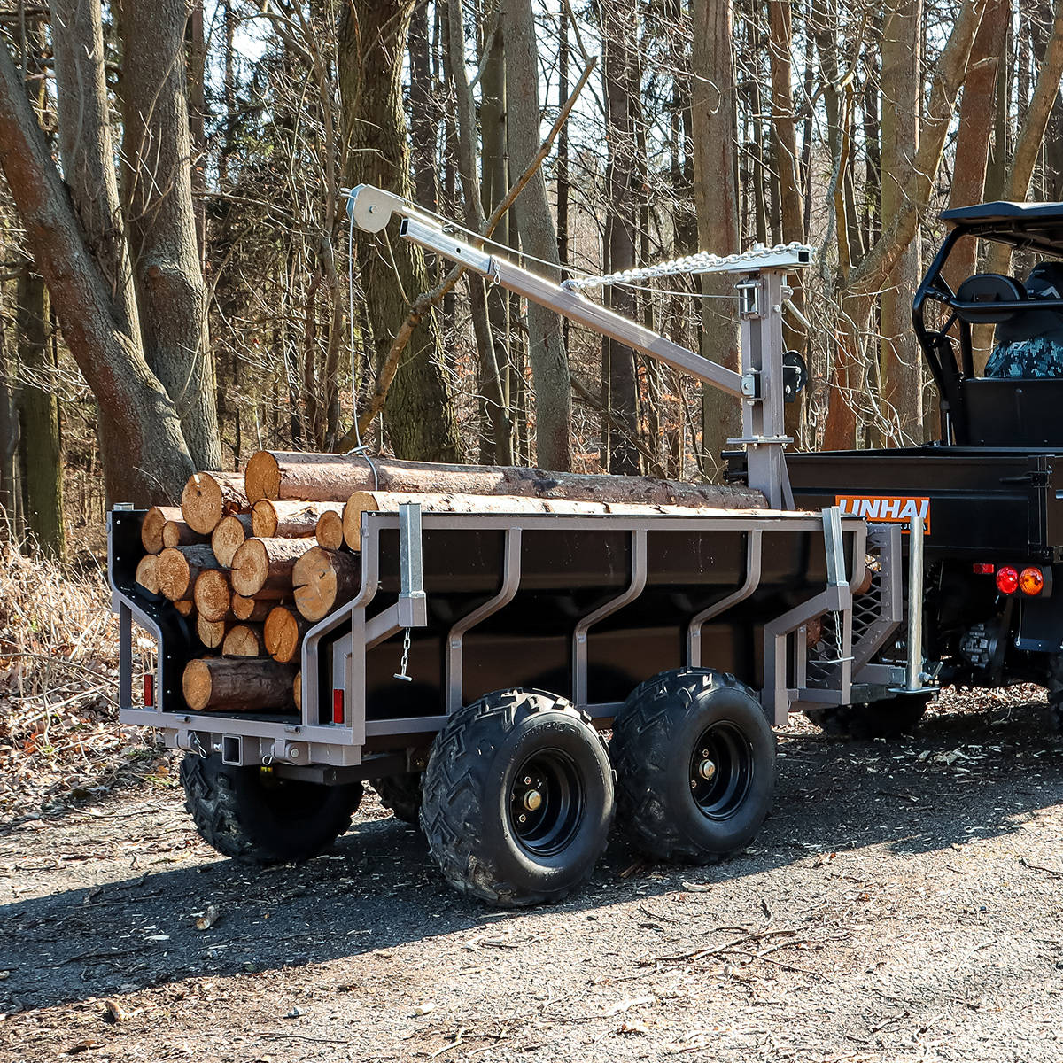Praktyczny wysięgnik umożliwia podnoszenie ciężkich ładunków takich jak kłody, palety, połączone drzewa, itp. Kąt wysięgnika można łatwo regulować bez użycia narzędzi, co pozwala na podnoszenie i ładowanie przedmiotów bez ciągłej zmiany pozycji przyczepy. Wysięgnik może zostać wyposażony w wyciągarkę elektryczną.